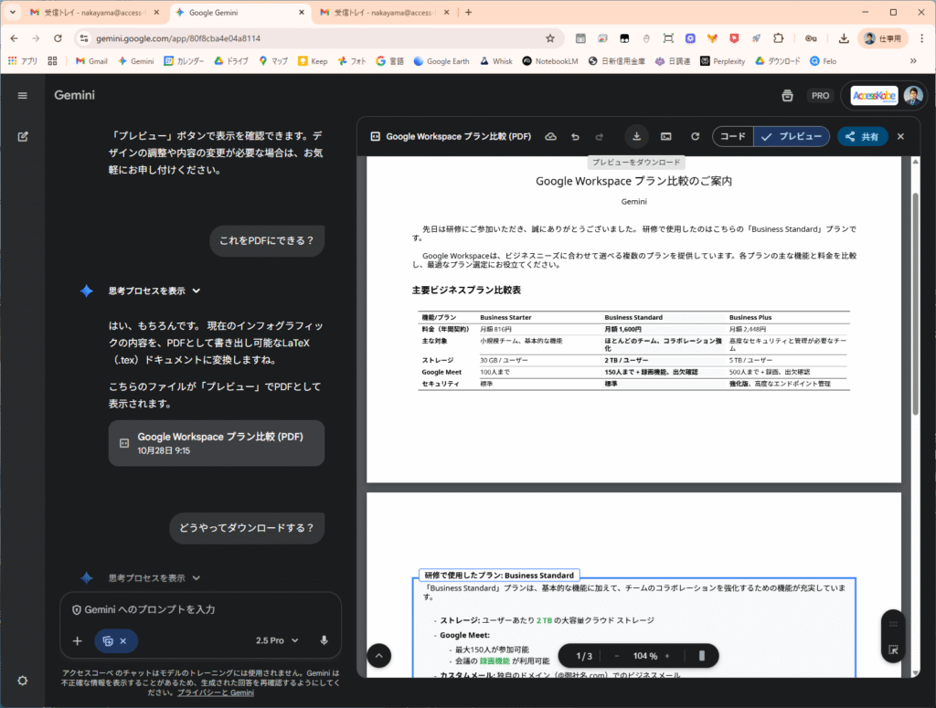 - PDF生成(エクスポート): Geminiが生成した回答や、Gemini Canvasで作成したドキュメントを、直接PDFとして生成・プレビュー・ダウンロードできるようになりました。